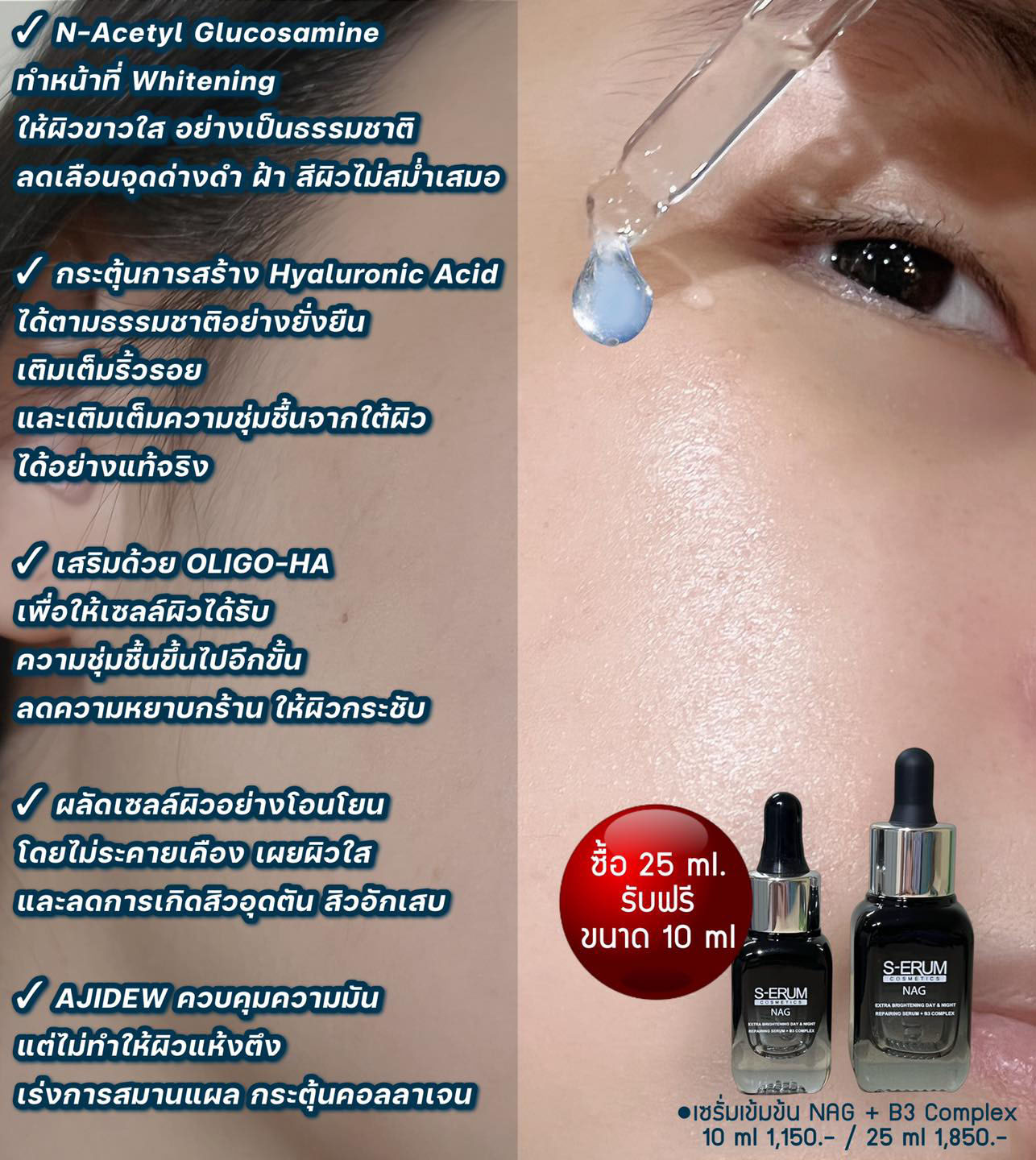 S-ERUM NAG ยังมีประสิทธิภาพในการลบลดรอยจุดด่างดำที่ไม่สม่ำเสมอ รวมถึงกระตุ้นให้ผิวสร้าง Hyaluronic Acid ให้เพิ่มขึ้นถึง 45% ได้ตามธรรมชาติ ทำให้ผิวดูอิ่มน้ำ ฟูขึ้น ดูผิวนุ่มชุ่มชื้น เมื่อใช้อย่างต่อเนื่อง 180 วัน จะลดริ้วรอยได้อย่างดีเยี่ยม