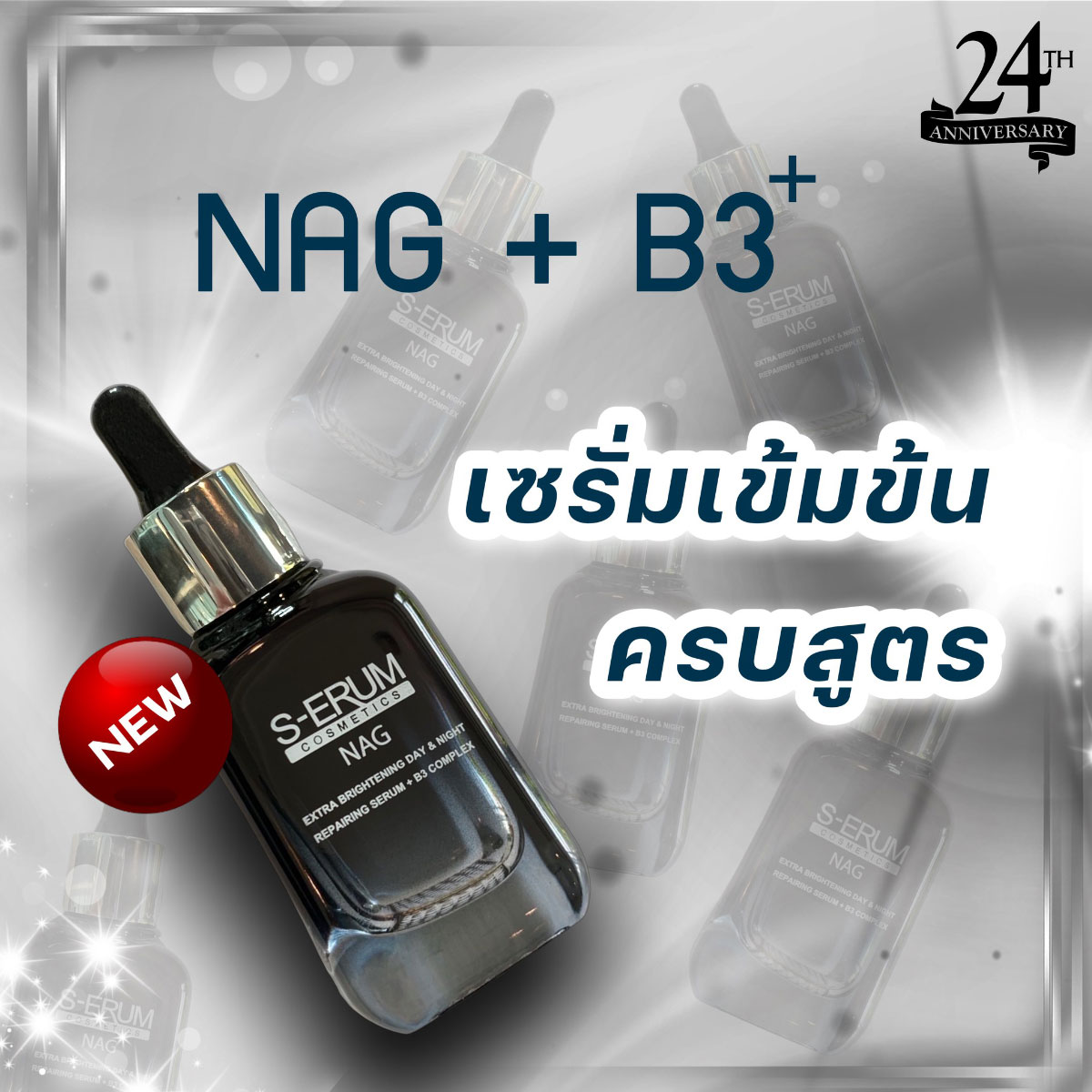 S-ERUM NAG เลขที่จดแจ้ง 12-1-6500011561 เซรัมเข้มข้นสูตรเฉพาะจาก S-ERUM ที่พัฒนาสูตรให้เหมาะกับวิถีชีวิตที่ต้องเร่งรีบ แต่ต้องการประสิทธิผลที่รวดเร็ว ในขณะเดียวกันก็ต้องยั่งยืน หยุด ๆ ใช้ ๆ ได้ไม่เกิดผลเสียกับผิว
